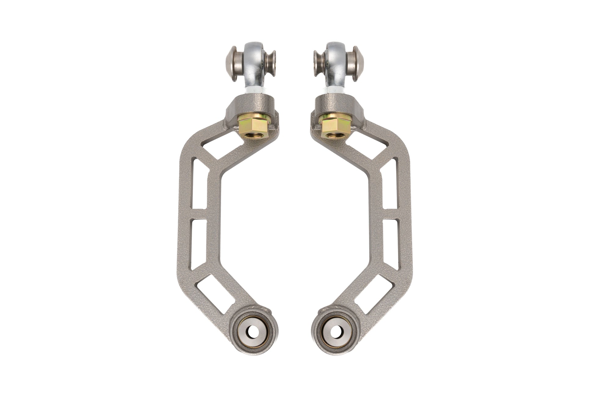 Ford Mustang S550 Rear upper control arms are used to adjust camber, these arms are made from high strength alloy steel, and feature a double adjuster allowing for full adjustment without removing the arm. The arm also has a locking collar, meaning 1 less jam nut is needed. This will reduce the chance of loosening under hard abuse. (RUCA)
