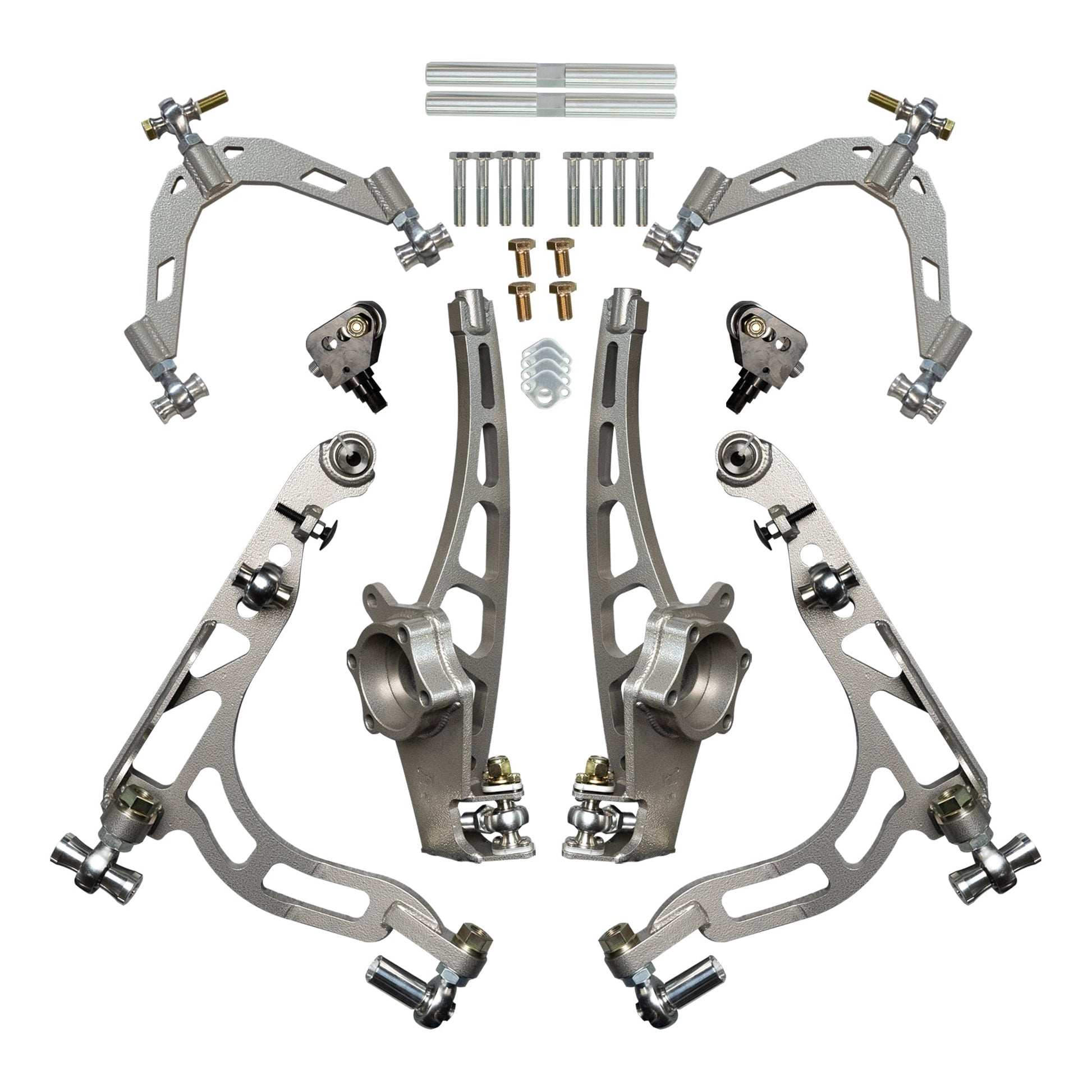 The Mega Mantis kit features a full knuckle design and uses the OEM 350Z bearing hub, so replacements down the road are quick and easy. The lower control arms have uniballs at the knuckle connection, plus smooth adjuster points on both pickup spotsβmaking alignment changes a breeze right on the car.