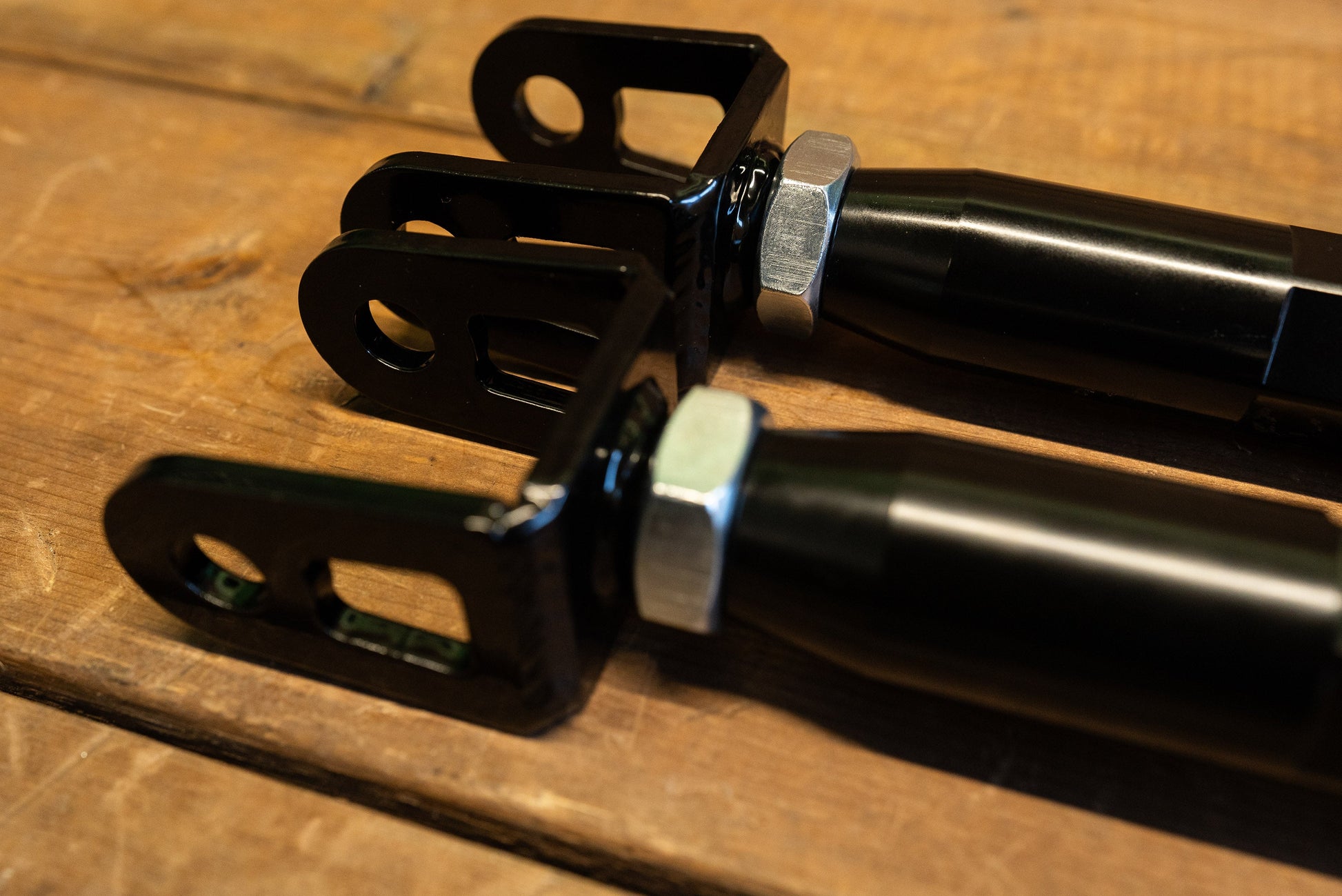 Our rear traction arms are designed and manufactured in-house using CNC machined Aluminum bodies, thick steel shackles, heavy-duty Heim joints, and an anodized protective finish